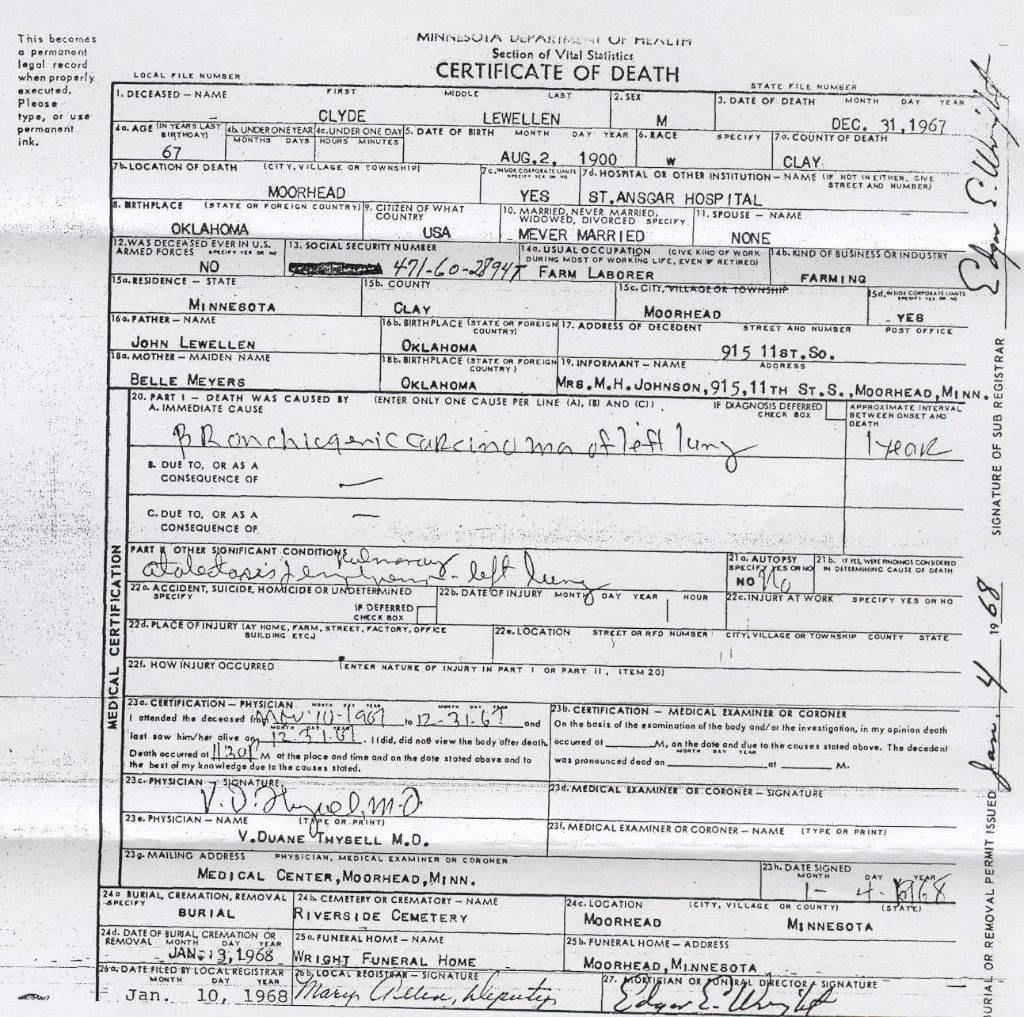 Description: Clyde Lewellen Death Cert found in MINN Lost son of John Riley and Bell Morrie Lewellen . After years of research finally found my dad's brother