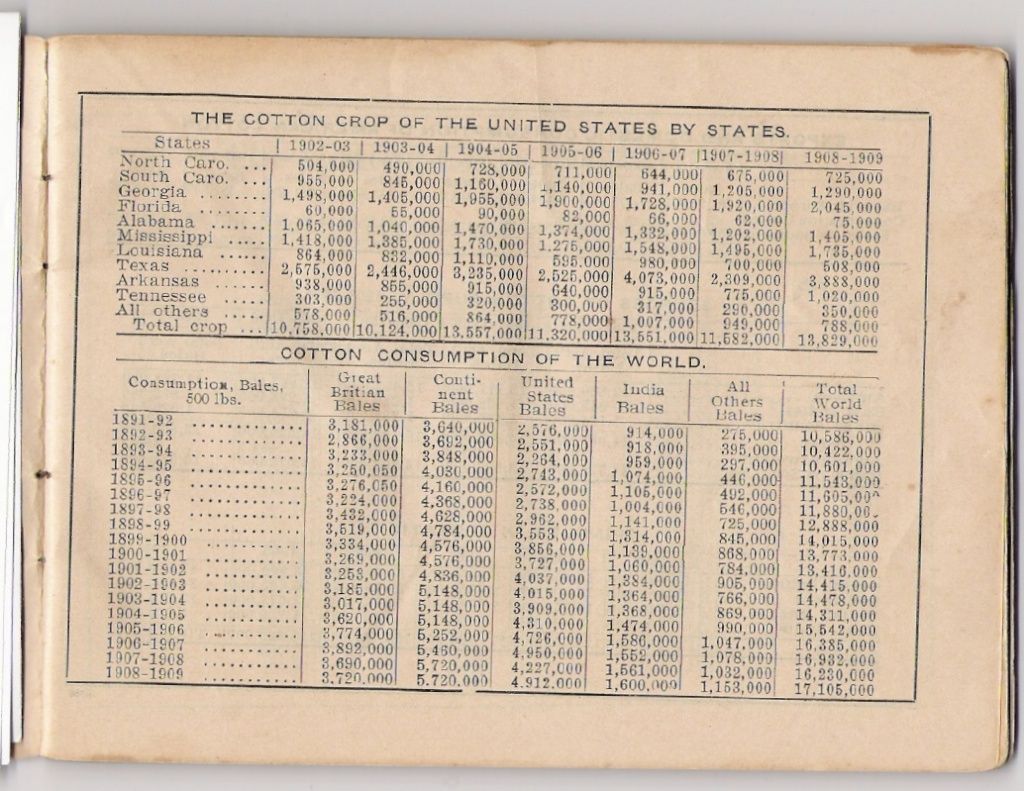 Description: Cotton crop of the United States by states 1902 to 1909 and Cotton consumption of the world 1891 to 1909. Click on picture to enlarge.