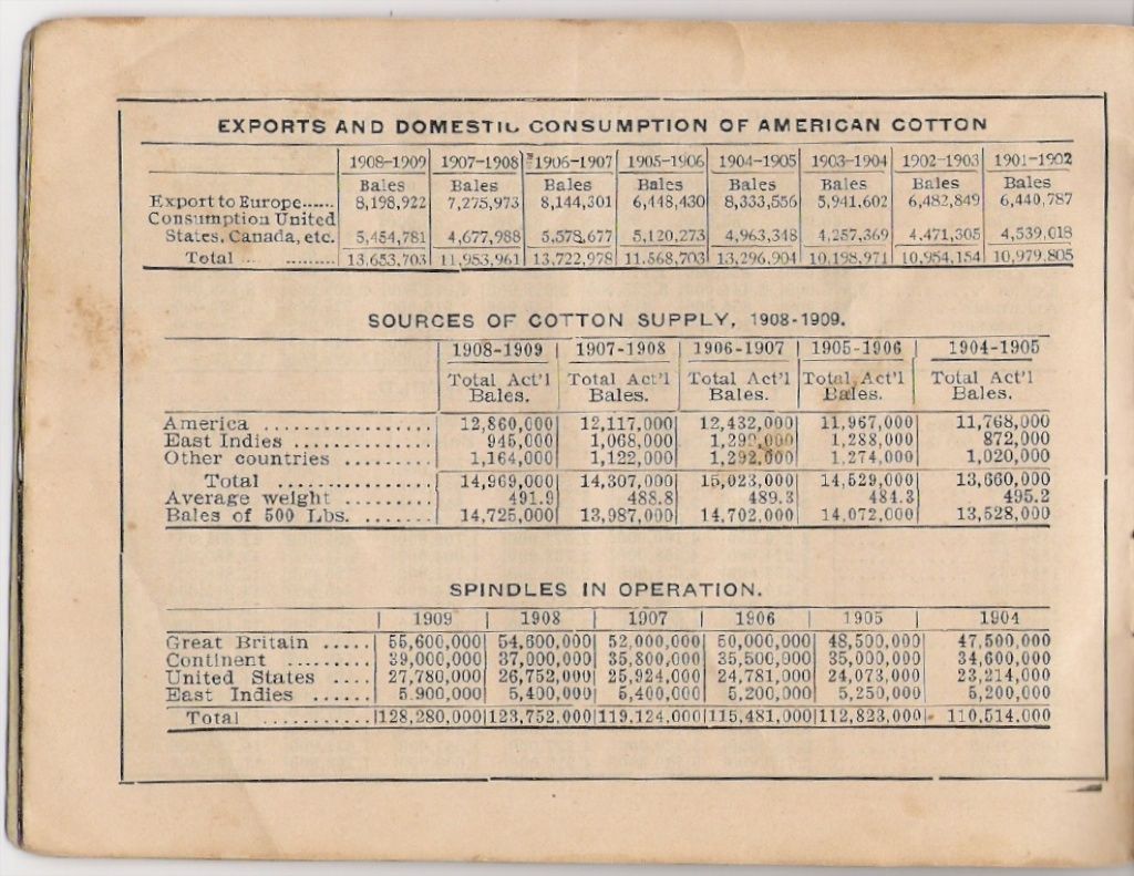 Description: Exports and domestic consumption of American cotton 1901-1909. Sources of cotton supply 1904-1909 and spindles in operation. Click to enlarge picture.