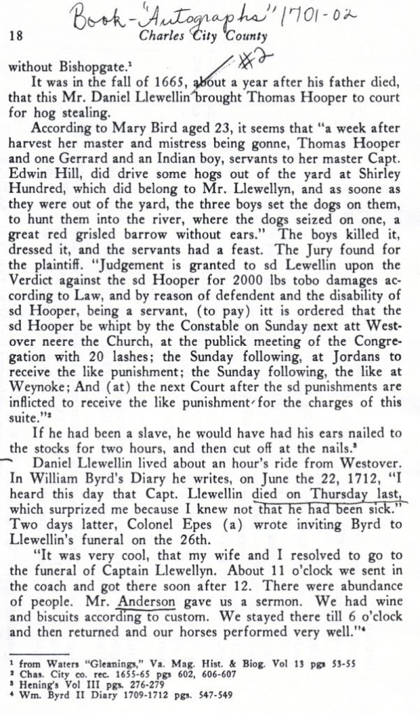 Description: In the fall of 1665 Daniel II of Virginia took a man to court for hog stealing. This photograph provides an account of this, as well as William Byrd's account of attending the funeral of Daniel I.