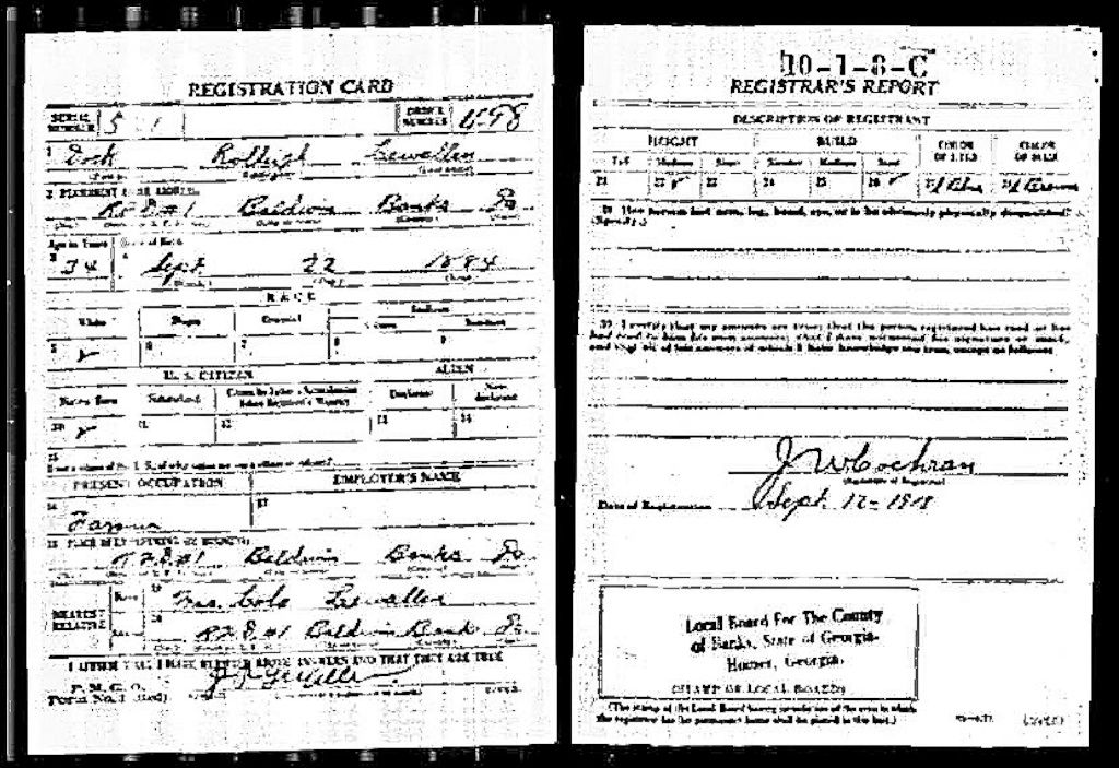 Description: World War I draft registration card for Dock Rolleigh Lewallen b. 1884