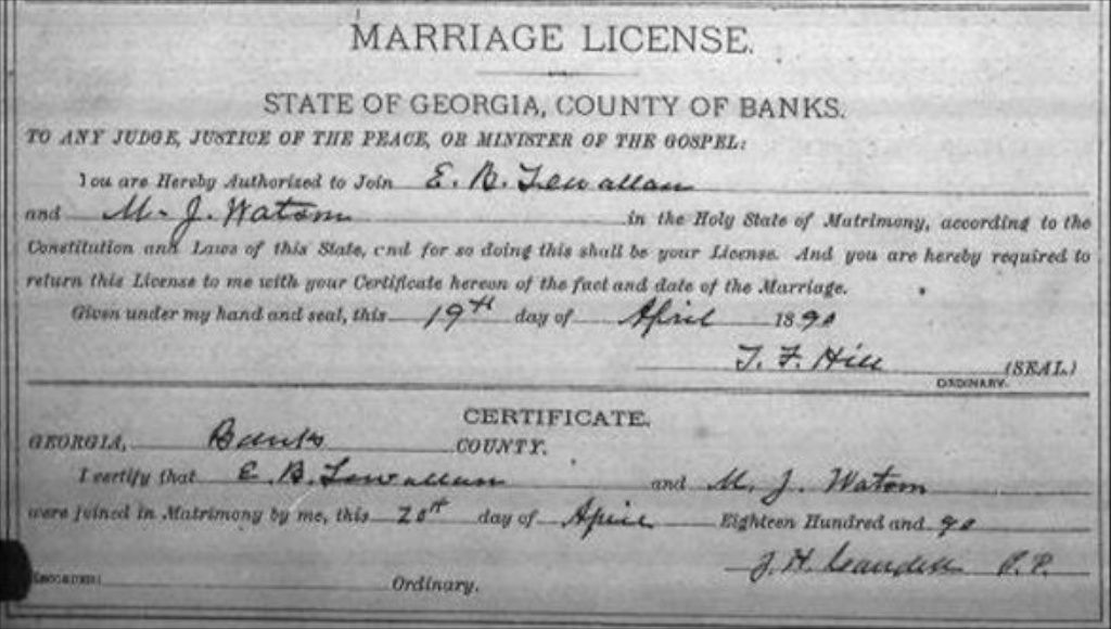Description: Enoch Brady Lewallen & Mary Jane Watson - 20 Apr 1890 - Banks Co, GA.