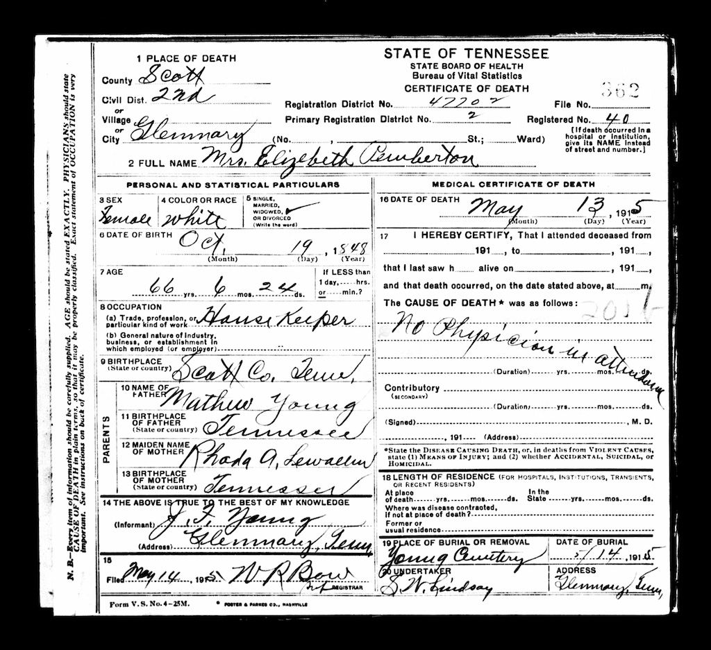 This one has me very puzzled. Mathew & Rhoda Ann Lewallen Young did in fact have a daughter named Elizabeth Young, but I have always been told she was never married, yet this DC has consistant almost correct dates.
