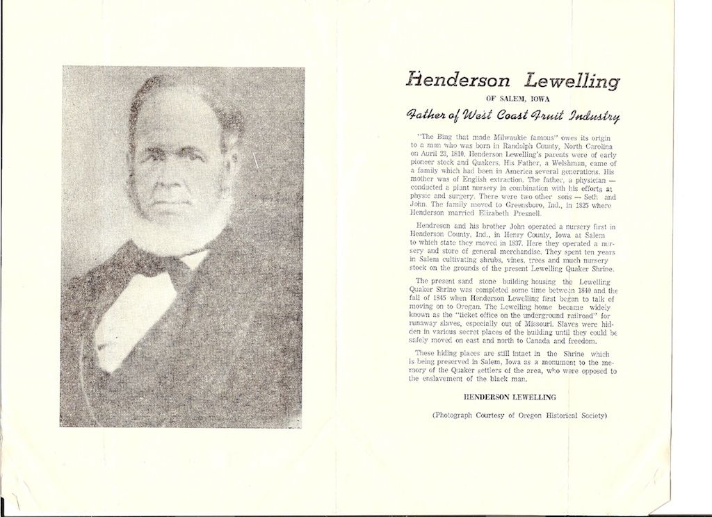 "The Bing that made Milwaukie famous" owes its origin to a man who was born in Randolph County, North Carolina on April 23, 1810. Henderson Lewelling's parents were of early pioneer stock and Quakers. His Father, a Welshman, came of a family which had been in America several generations. his mother was of English extraction. The father, a physician - conducted a plant nursery in combination with his efforts at psysic and surgery. There were two other sons - Seth and John. the family moved to Greensboro, Ind. in 1825 where Henderson married Elizabeth Presnell.