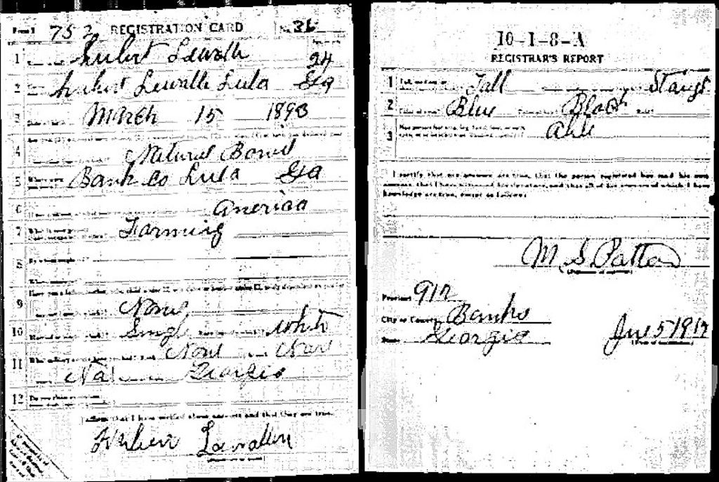 Description: World War I draft registration card for Hubert J Lewallen b. 1893