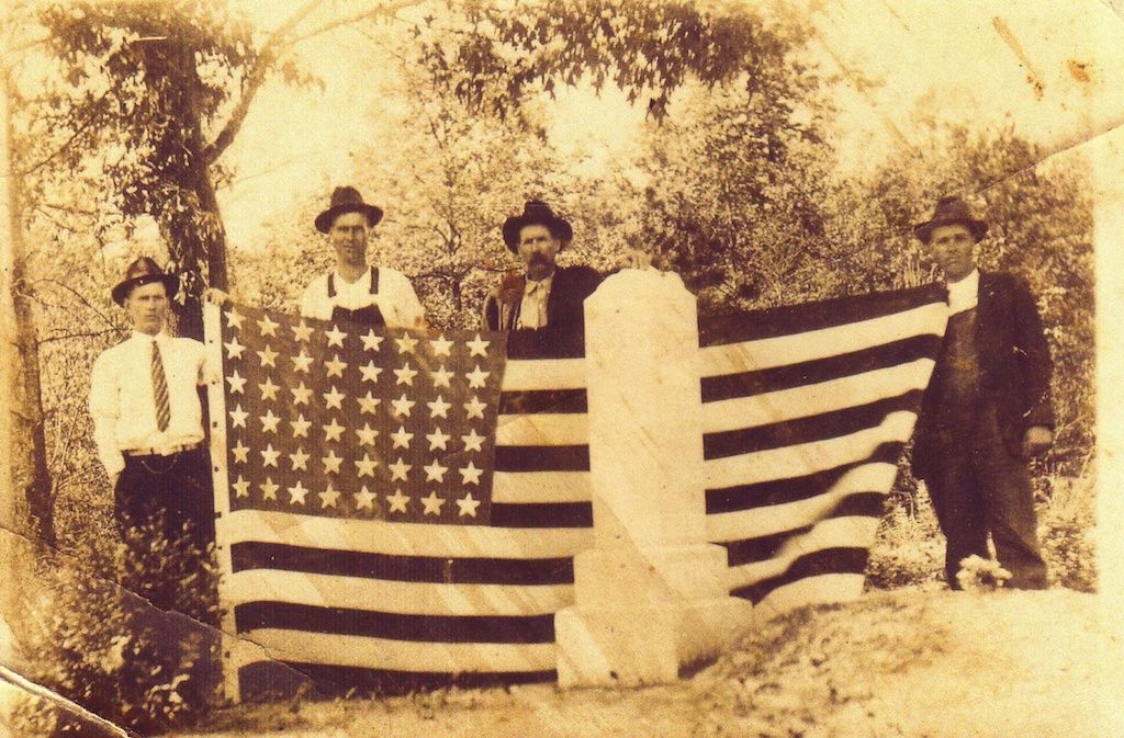 Description: This is the flag that came with Hugh Lewallen's body when it was shipped from overseas. He was killed in France, WWI. His father, John Lewallen, is third from left. The other men are unknown.