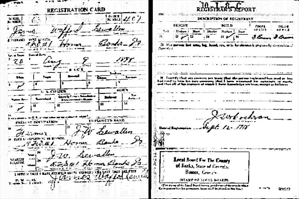 Description: World War I draft registration card for James Wofford Lewallen b. 1898