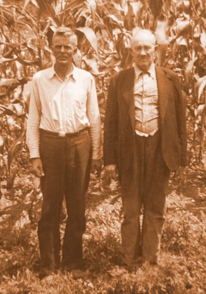 Description: On the left is my father, Joseph Robert Baker (1892 - 1982). On the right is Balaam Eugene Lewallen (who assumed his mother's surname, Morris, in 1911). Eugene (1872 - 1952) was a son of Robert H. Lewallen and his wife, Martha Ann Morris.