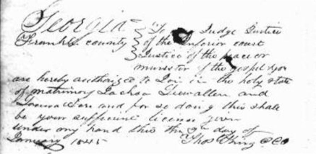 Description: John Jackson Lewallen & Louisa Acree (or Acres) - 9 Jan 1845 - Franklin Co, GA.
