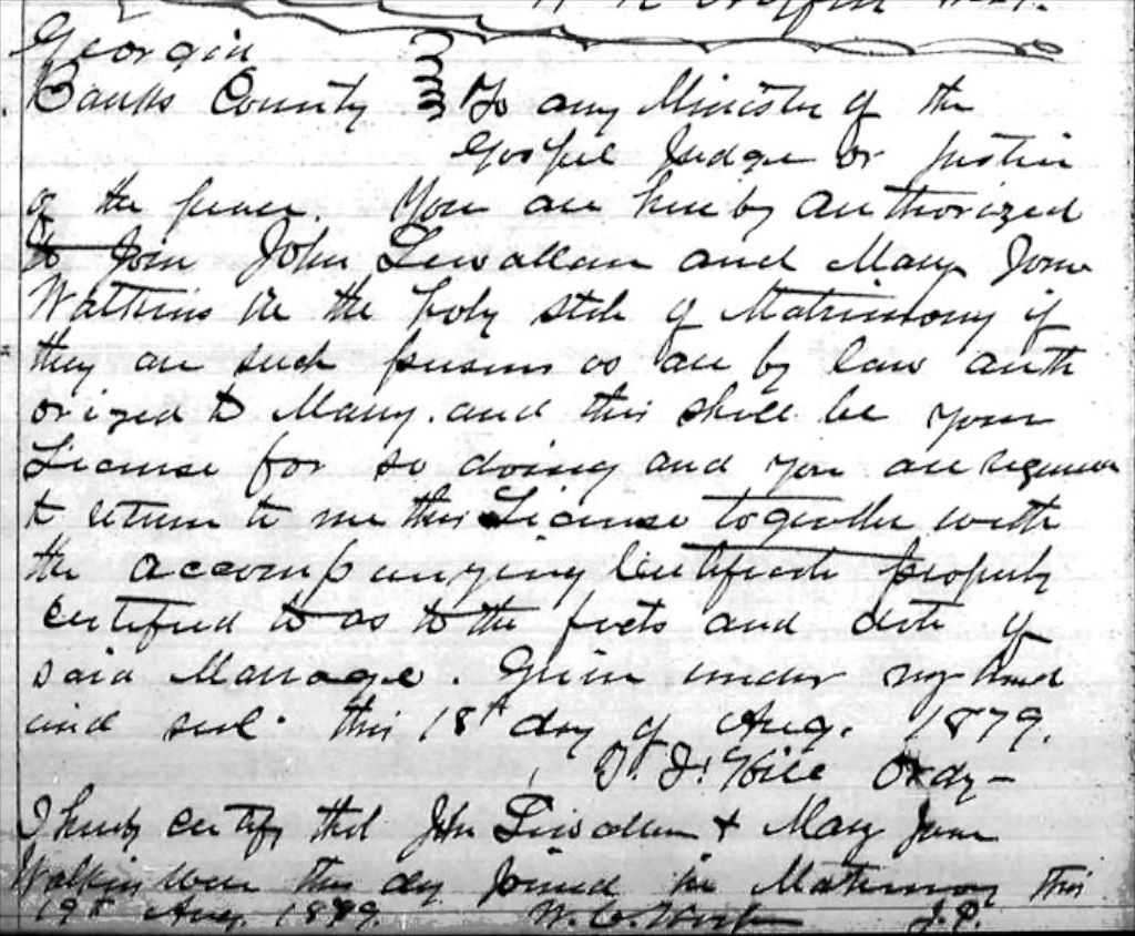 Description: Marriage Certificate for John Lewallen & Mary Jane Watkins 1879