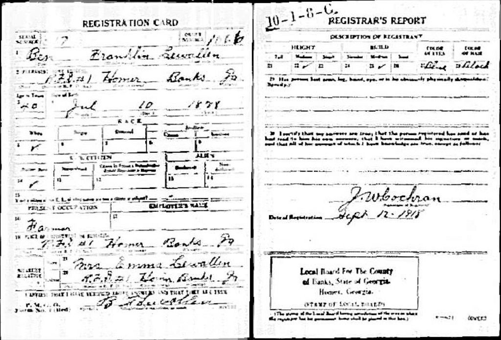 Description: World War I draft registration card for Benjamin Franklin Lewallen b. 1878
