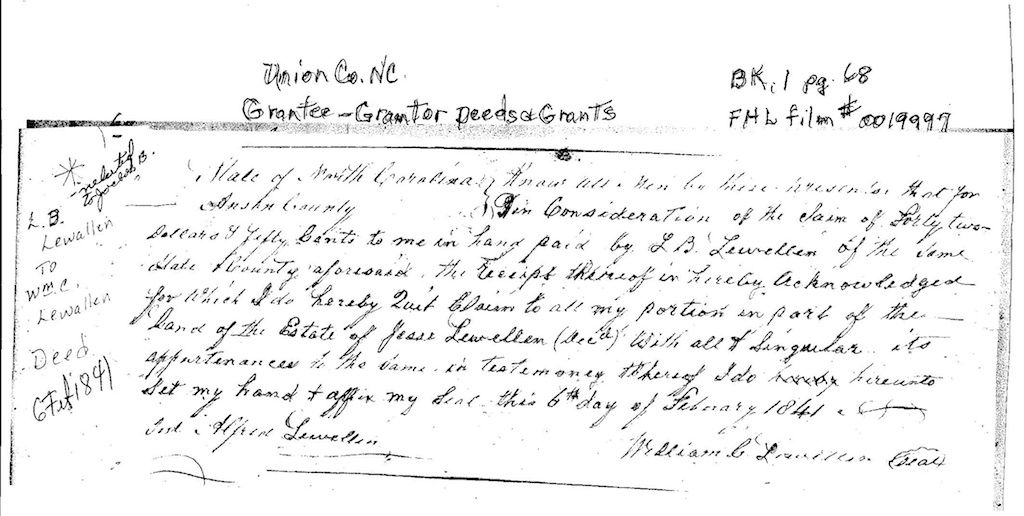 Description: William C. Lewellen sells his portion of estate from his father, Jesse Lewellen, to an heir of Jacob B. Lewellen, [deceased]a son of Jesse & Dorcus.
