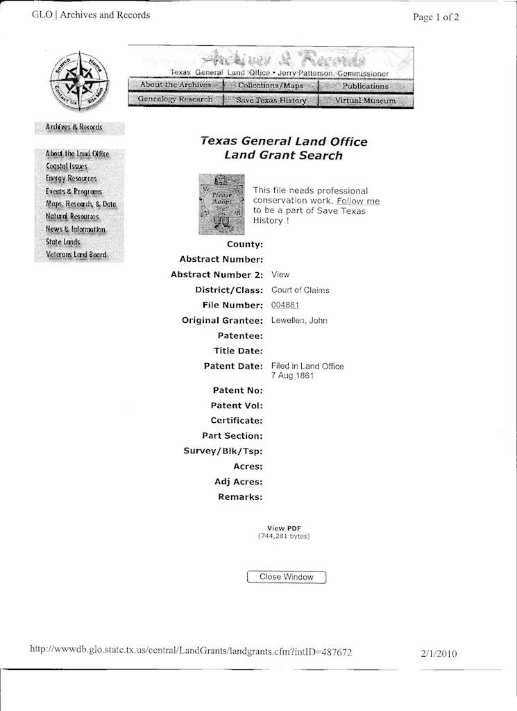 Description: I found this but it has no county listed and 1861 would be too early for John Lewellen 1812 to be in Texas. Maybe someone knows who it is.