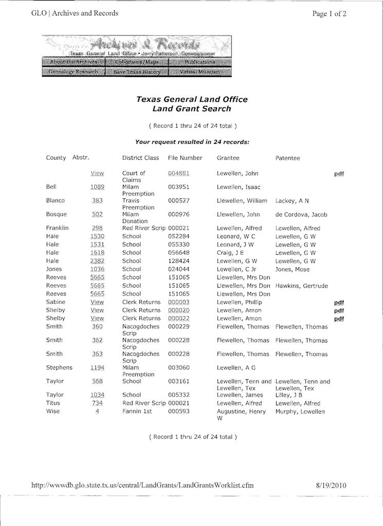 Description: This is one of the indexes for the land grants. There are some pdf files attached but I was not able to get one to open this morning. If you are interested go to the www.glo.state.tx.us/archives/landgrant.html click on the red printed words Land Grant Database and a purple fill in the blank form will come up then type in any name Lewallen, Lewellen or etc. and an index like the one here will come up