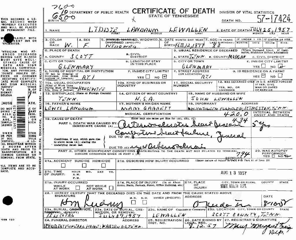 Headstone has Lydia DOB as February 12, 1873- Death Certificate has DOB as February 12, 1877 and states that she was 80 at time of death. Kathleen Lewallen Fulwiler was informant.