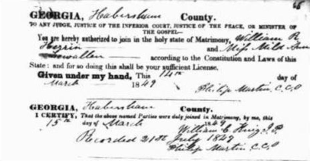 Description: Milda Ann Lewallen & William Rodney Herrin - 14 Mar 1849 - Habesham Co, GA.