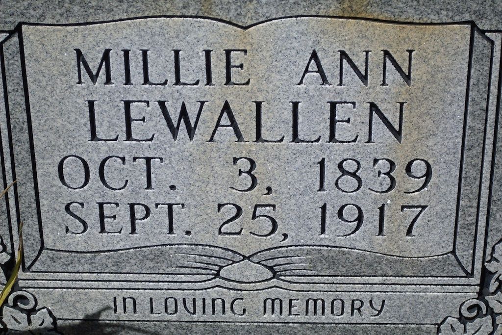Description: Millie Ann Young Lewallen wife of Campbell, daugher of Matthew Young and Elizabeth Lewallen. Mother of my ggrandmother Louisa Delilah Lewallen Watts. She had 2 stones, this was the newer one.
