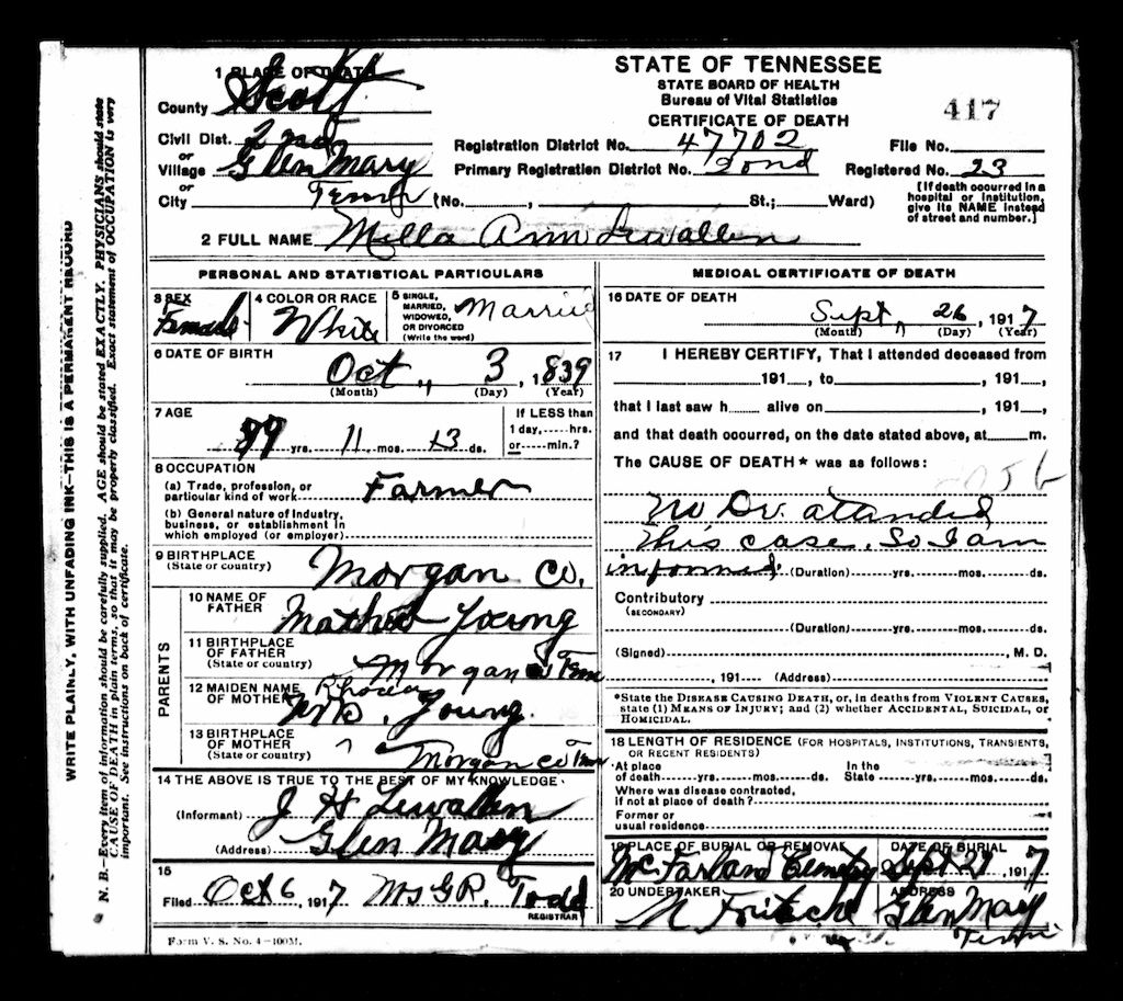 Malinda Ann Young Lewallen (wife of Campbell County Lewallen) Her mother was also Elizabeth Lewallen.