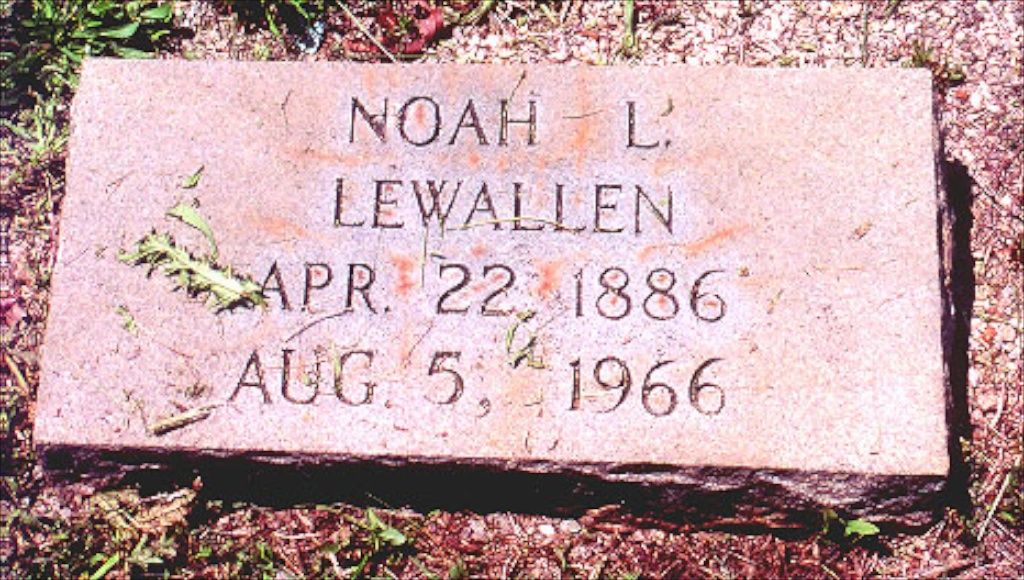 Description: Tombstone of Noah Lumpkin "Dig" Lewallen 1886-1966. Dig ran the Moss' Mill grist mill and he ran the tanning tanks for the community in and around Hollingsworth.