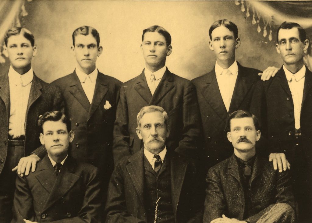 Description: Thomas Marion Lewallen and his sons: William Henry, James Franklin, John Daniel, Alonzo, Alvis Marion, Hubert Lendon & Thomas Calvin.