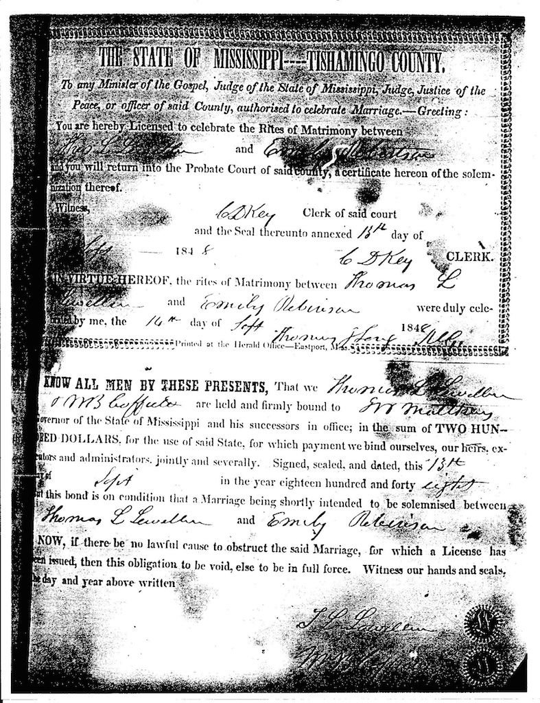 Description: Marriage record for Thomas L & Emily J. [Robinson] Lewellen, from Tishomingo Co., MS. records.