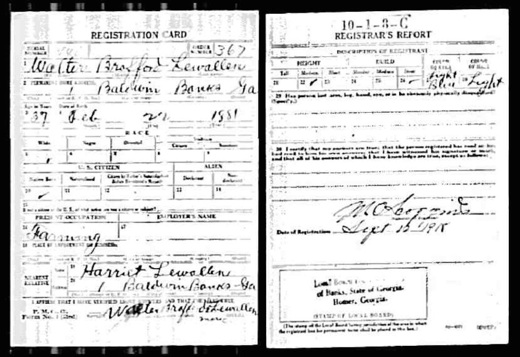 Description: World War I draft registration card for Walter B Lewallen b. 1881