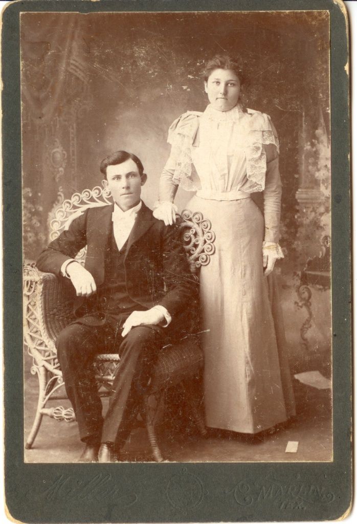Description: William Calvin Lewallen, b. 1873, d 1906 with wife Opal Mittye Wren. May be wedding photo. Married 10/9/1898