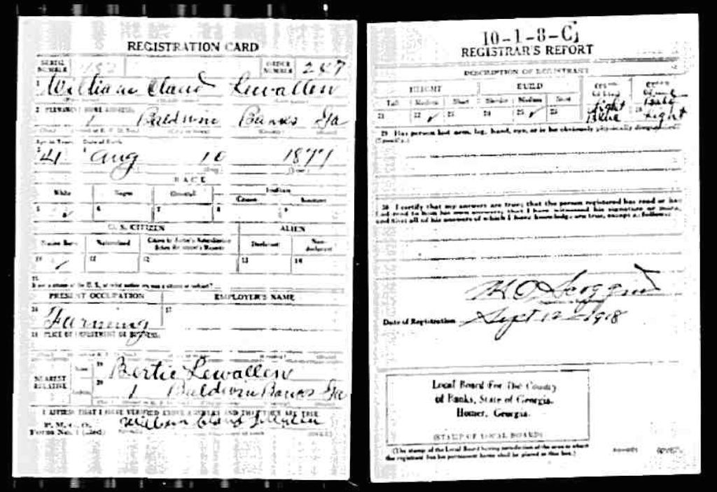 Description: World War I draft registration card for William C Lewallen b. 1877