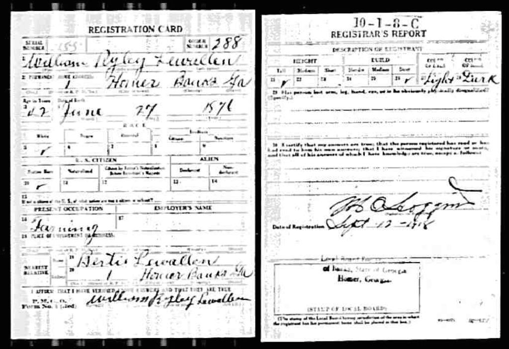 Description: World War I draft registration card for William Ryley Lewallen b. 1876