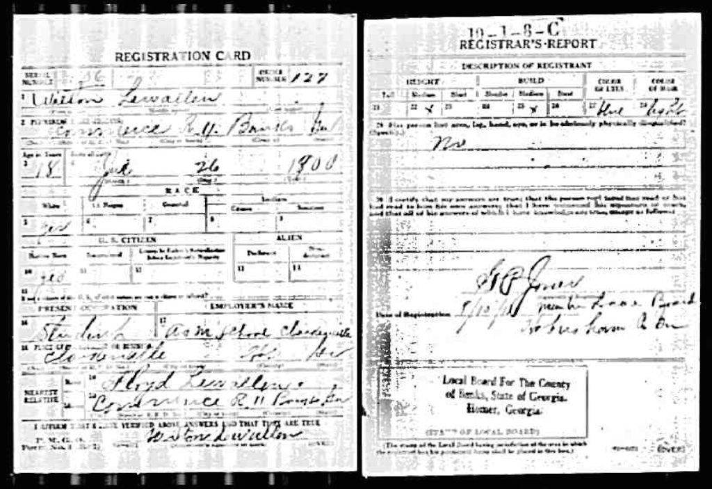Description: World War I draft registration card for Wilton Lewallen b. 1900